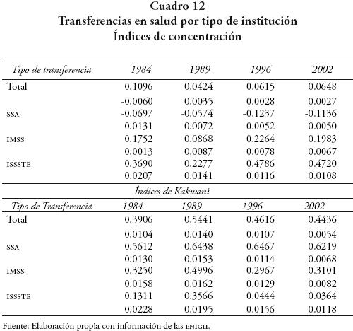 Una vez explicadas brevemente la lógica y justificación de los índices a utilizar, se procede a su interpretación. Así, el coeficiente de concentración de las trasferencias totales en salud para los diferentes años de estudio, muestra una tendencia decreciente, lo que implica que este tipo de trasferencias sean en el último año de análisis casi neutrales, después de mostrar en un inicio cierta preferencia hacia los mayores ingresos. Sin embargo, por tipo de institución proveedora de salud, existen divergencias importantes (cuadro 12).
