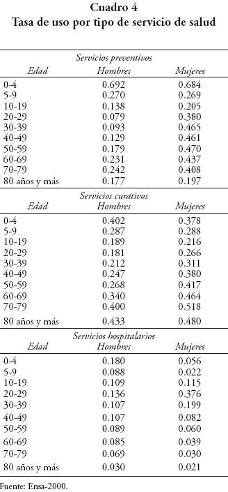 Dado que el gasto promedio reportado de servicios médicos es familiar, para obtener el gasto promedio por persona, simplemente se tomó en cuenta el número promedio de personas que hicieron uso de estos servicios por familia,9 lo cual es de gran utilidad ya que, posteriormente, al combinar la tasa de probabilidad de asistencia al médico por sexo y edad, inferida de la Ensa2000, se puede imputar el monto de transferencia médica por individuo, propiciando mayor exactitud en la estimación en el uso de los servicios de salud, ya que ello permite calcular las diferentes probabilidades de utilizar servicios médicos por edad y sexo, como sucede en la vida real.