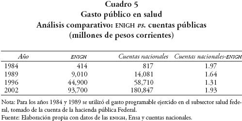 Finalmente, se comprobó que el monto estimado total de servicios públicos de salud otorgado a los hogares vía trasferencias, sí coincide con el gasto en salud pública reportado por las fuentes macroeconómicas. Antes de ello, es necesario mencionar la inexistencia en México de datos consolidados del gasto en salud, de modo que esta carencia de datos agregados oficiales dificulta la comparación. Además, algunas instituciones de salud destinan cuantiosos recursos a gastos que no son propios de este rubro, y es difícil distinguir entre gastos en salud y otros tipos de erogaciones.