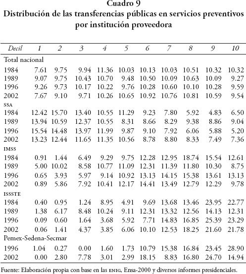 En suma, se observa un cambio en la estructura de las transferencias en salud durante los últimos 18 años. Este cambio ha propiciado una evolución desde una estructura donde 40% de las familias con mayores ingresos recibían una participación más que proporcional en el año 1984, hacia una estructura en la que de los deciles cuarto al octavo captan una proporción de transferencias en salud ligeramente mayor a la que tenían en el primer año de estudio. Esto indica un ligero movimiento a favor hacia los deciles que representan las clases medias, en principio este ya es un cambio positivo, pero que se debe consolidar mediante un mayor beneficio hacia el 30% de las familias con menores ingresos, quienes aún registran transferencias menos que proporcionales de las que les correspondería, simplemente por su peso demográfico (cuadro 8).
