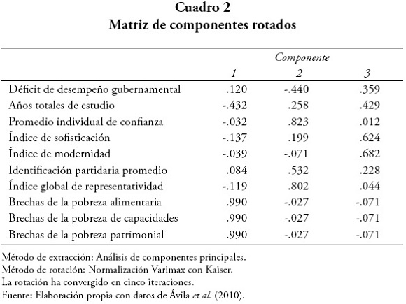 Además de la baja representatividad de la élite política, resaltan dos datos adicionales: el bajo nivel de confianza en las instituciones y la relación positiva entre escolaridad y abstención para los ingresos medios, que muestra elocuentemente el divorcio entre esfuerzo y bienestar que ha acarreado la suspensión del proceso de modernización. Para reforzar estos datos, exhibimos la aglutinación de los determinantes por el método de componentes principales (cuadro 2).