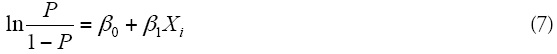 Donde P es la probabilidad de abstenerse y, por tanto, 1-P es la probabilidad de votar; X es una variable independiente que determina o predice esa probabilidad, y el conjunto de β representan los parámetros correspondientes. Por otro lado, ln es el logaritmo natural.