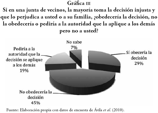 Para determinar esta actitud hacia la ley, la encuesta inquirió una pregunta que trata de desvelar la separación entre lo justo y lo legal. Las respuestas se muestran en la gráfica III.