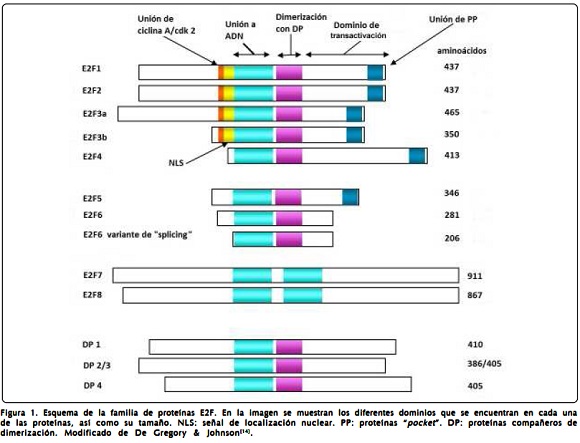 En el genoma de mamíferos, las proteínas E2F están codificadas por ocho genes diferentes que dan lugar a nueve proteínas distintas (Figura 1). El único miembro de esta familia que codifica dos proteínas a través del uso de promotores alternativos, es el factor E2F3[19]. Todas las proteínas E2F muestran un alto grado de identidad en su dominio de unión al ADN, lo cual se demostró con estudios in vitro, donde se observó que todos los factores se pueden unir a la secuencia consenso 5'-TTTNNCGC-3' (donde N puede ser G o C).