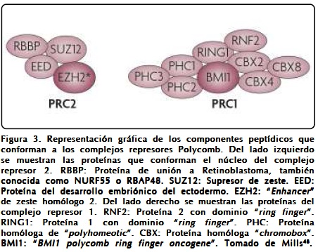 En mamífero, las cuatro subunidades que forman el núcleo de PRC1 son PHC, CBX, BMI1 y RING1 que en Drosophila melanogaster son los homólogos de Ph, Pc, Psc, y dRing, respectivamente (Figura 3). Así mismo, en mamíferos hay al menos cuatro parálogos de la proteína con dominio "Ring finger" Psc, que son: BMI1, Mel18, MBLR y NSPc1. Un aspecto relevante es que éstas interactúan con otras proteínas PcG para formar subtipos de complejos PRC1, por ejemplo NSPc1 y RING1B son parte del complejo represor BCOR[50], mientras que MBLR y RING1B están relacionados con E2F6 con funciones represoras[51]. Cabe resaltar que la importancia de que se formen diferentes sub-complejos de PcG radica en que de esta manera se asegura una diversificación de blancos de Polycomb. En la Tabla I se describen más funciones de cada una de estas proteínas.