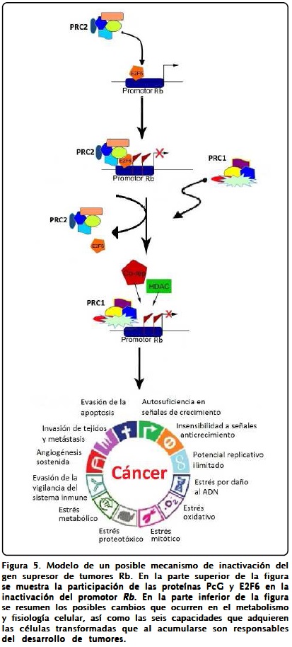 La actividad mejor conocida y más estudiada de la proteína Rb es la capacidad de reprimir la transcripción de los genes regulados por la familia de factores E2F. En la mayoría de las plantas y animales, los miembros de la familia Rb proveen un freno importante en la actividad de los factores E2F, en consecuencia, la ausencia de esta restricción coloca a las células en un estado permisivo para proliferar y preparadas para responder a señales pro-proliferativas. Las proteínas de la familia Rb bloquean la transcripción promovida por los factores E2F activadores (E2F1, 2 y 3) y activan la transcripción de aquellos blancos en complejo con los E2F represores (E2F3b, 4 y 5)[21]. En la Figura 2 se muestra el papel de la proteína supresora de tumores Rb y de algunos componentes de la vía, lo que en el pasado explicaba que la pérdida de función, básicamente ocurría a nivel de proteína o por mutaciones de su gen. Sin embargo, ahora se sabe, y es lo que queremos resaltar en esta revisión, que la pérdida de función supresora de tumores puede ocurrir mediante acciones epigenéticas orquestadas por Polycomb, los factores E2F (en particular E2F6) y por el mismo Rb, así como por la interrelación con otros factores epigenéticos como HDACs, HMTs, DNMTs y la proteína HP1. Dos ejemplos de la actividad epigenética de la proteína Rb son: el primero, un estudio del locus p16INK4A en 2007, donde se demostró que la incorporación de la marca H3K27me3 llevada a cabo por PRC2, no ocurría o disminuía en ausencia de proteínas funcionales de la familia Rb[76]. El otro ejemplo es el descrito por Longworth donde demostró que Rb está involucrado en los procesos de compactación de la cromatina que ocurre en la mitosis, en la senescencia y la formación y/o redistribución de heterocromatina, es decir, Rb y los otros miembros de la familia participan en la formación y organización de dominios transcripcionales[77].