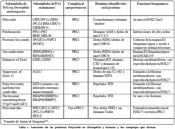 Cada vez hay más evidencia que sustenta la participación de las proteínas del grupo Polycomb (PcG) en la regulación transcripcional de genes implicados en la mayoría de procesos celulares importantes, tales como el control del ciclo celular, la diferenciación y el desarrollo, entre otros[25]. Por lo que en esta sección se explicará la relevancia de esta familia de proteínas. Los genes del grupo represor PcG y del grupo activador Trithorax (trxG) codifican para co-reguladores epigenéticos antagónicos. Las proteínas PcG en un inicio se identificaron genéticamente en la mosca de la fruta, Drosophila melanogaster, como factores requeridos para mantener la expresión correcta en tiempo y espacio de los genes homeóticos a través del desarrollo[7]. La familia Polycomb consiste de alrededor de 20 proteínas, las cuales pueden formar distintos complejos multiprotéicos que tienen la capacidad de influir en la estructuración de la cromatina vía un arreglo de distintas actividades modificadoras de las histonas[26,27]. Se ha demostrado que se asocian entre ellas para formar diferentes tipos de complejos represivos, de los cuales a la fecha se ha reportado que existen los que contienen a la proteína Polycomb (Pc), llamados genéricamente: complejo represor Polycomb 1 (PRC1 y PRC1-like), también conocido como complejo de mantenimiento del silenciamiento. De estos complejos se ha predicho que en vertebrados existen al menos sesenta combinaciones posibles entre las proteínas que conforman PRC1[28]. También existen los que contienen a la proteína Enhancer de Zeste (E(z)), llamados genéricamente complejo represor Polycomb 2 (PRC2) o complejo de inicio del silenciamiento[29]. Algunas de las proteínas PcG de Drosophila tienen homólogos en humano y en otras especies que incluyen desde plantas, nemátodos, peces hasta aves. En la Tabla I se muestra un compendio de estas proteínas y algunas de sus funciones. El mecanismo de acción de estos complejos se describirá con detalle más adelante, pero de manera muy general se ha demostrado que estos complejos tienen que ser atraídos en forma secuencial a su sitio blanco. El PRC2 es el primer complejo que se recluta y el que inicia el proceso de silenciamiento marcando dicha zona genómica con la trimetilación de la lisina 27 de la histona H3 (H3K27me3). Esta marca es "leída" por el complejo represor PRC1 el cual modifica la lisina 119 de la histona H2A para reforzar el silenciamiento, y además favorecer interacciones con otras proteínas represoras como HP1, DNMTs y HMTs[30].