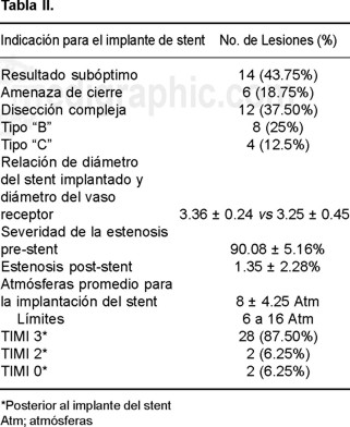 Características angiografías: se analizaron los 32 stents implantados exclusivamente en las arterias responsables de la isquemia. Se logró éxito angiográfico 30 segmentos (93.75%) en dos de las oclusiones totales (6.25%) se fracasó, hubo fenómeno de "no-reflujo" asociándose imagen sugestiva de trombo residual. La indicación para la implantación del stent fue: resultado subóptimo catorce (43.75%), disección compleja 12 (37.5%), amenaza de cierre en seis (18.75%). El tipo de lesión más frecuentemente encontrado fue tipo B1 en 22 (68.75%) y B2 en seis (18.75%), seguida por tipo "C" en cuatro (12.50%), en nuestra casuística no se observó enfermos con lesiones tipo "A". La relación entre el diámetro de los stents implantados y el diámetro del vaso receptor de 1.01 (3.36 ± 0.24 vs 3.25 ± 0.45).