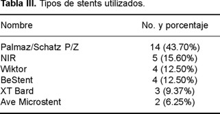 El grado de severidad de la estenosis pre-stent fue de 90.08% ± 5.16% y post stent 1.35 ± 2.28%. Las atmósferas que se requirieron para la implantación de los stents fueron de 8 ± 4.25 con (límites de 6 a 16) (Tabla II). En la coronariografía diagnóstica el flujo coronario fue de TIMI 3 en 28 lesiones, TIMI 2 en dos y TIMI uno en ninguno, TIMI 0 en dos con imagen sugestiva de trombo. Hubo necesidad de colocar balón de contrapulsación intraaórtico en un solo caso. Después del implante del stent se obtuvo flujo TIMI 3 en 28, TIMI 2 en dos y TIMI 0 en dos. Los tipos de stents utilizados fueron los siguientes: catorce Palmaz/Schatz (P/S Johnson y Johnson Interventional System), cinco NIR stent, cuatro Wiktor (Medtronic), tres Ave Micro Stent, cuatro BeStent (Medtronic) y dos XT (Bard), (Tabla III). En nuestra serie no hubo defunciones, ni reinfarto durante los procedimientos, así como tampoco existieron complicaciones y el tiempo promedio de hospitalización fue de 9 ± 5.7 días. La incidencia de trombosis del stent, eventos cardiacos y efectos colaterales de los medicamentos fueron prácticamente nulas. Entre las complicaciones menores sólo un paciente presentó hematoma inguinal que no ameritó tratamiento quirúrgico.