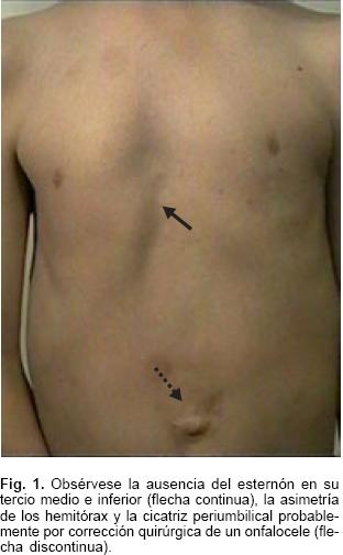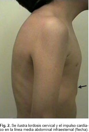 La exploración física con cráneo dolicocéfalo, pabellones auriculares de implantación discretamente baja, facies alargada con cianosis peribucal, y en la punta de nariz, discreto telecanto, escleras grisáceas, paladar íntegro con caries tratadas en piezas dentales, cuello cilindrico simétrico, tórax longilíneo, impulso cardíaco en línea media abdominal infraesternal (Figs. 1 y 2), soplo expulsivo en el cuarto espacio intercostal izquierdo, ausencia del segundo ruido pulmonar, diastasis de rectos, ausencia de la porción inferior del esternón, cicatriz a nivel del mesogastrio, genitales masculinos con ambos testículos dentro de bolsas escrotales. Extremidades con cianosis, dedos en palillo de tambor y uñas en carátula de reloj. Implantación proximal del segundo dedo en pie derecho, sindactilia cutánea entre el segundo y tercer dedo de ambos pies.