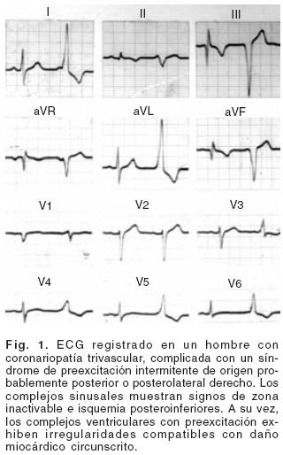 En presencia de un síndrome de WPW asociado a cardiopatía, las curvas eléctricas deben analizarse con apego a la sucesión del proceso de activación ventricular y a la posición y rotación cardíacas. Un intervalo de más de 30 mseg entre el fin del empastamiento inicial (delta) y el vértice de la onda R en las derivaciones izquierdas unipolares, que ven acercarse los frentes de la despolarización, o el eje mayor de las curvas vectocardiográficas ventriculares correspondientes, permite inferir la coexistencia de crecimiento del ventrículo izquierdo. Por su lado, irregularidades o distorsiones aisladas de las curvas eléctricas hacen sospechar la existencia de una zona inactivable circunscrita. Deformaciones extensas o múltiples de dichas curvas hacen pensar en daño miocárdico difuso. Aveces, pueden presentarse signos de preexcitación debida a la acción de fármacos.