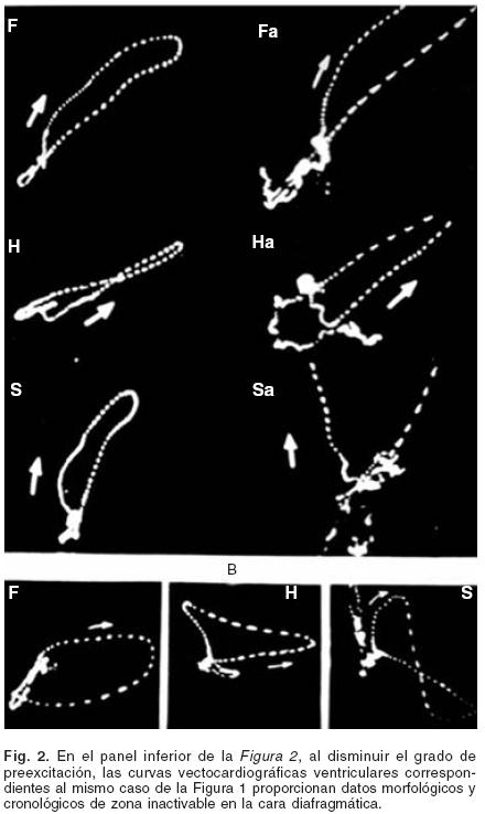 La existencia de fibras miocárdicas inactivables en la cara diafragmática ventricular izquierda se señala también por las curvas vectocardiográficas ventriculares con menor grado de preexcitación (panel inferior de la Figura 2). En el plano frontal (F), las primeras porciones de la curva ventricular se dirigen hacia arriba –con un empastamiento de 20 mseg– y la rama centrífuga cruza el eje transversal (de las X) a los 32 mseg después del fin del empastamiento delta. En el plano sagital (S), la primera porción de la curva ventricular, horaria, cruza el eje an teroposterior (de las Z) a los 35 mseg después del fin del empastamiento delta. El arranque posterior del VCGH autoriza a pensar en una extensión anteroposterior "en casquete" del miocardio inactivable.