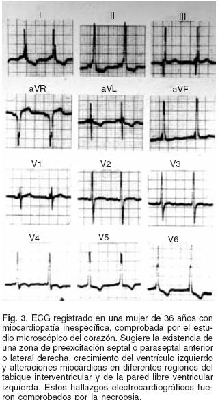 Ejemplo. El ECG de la Figura 3, registrado en una mujer de 36 años, señala una zona de preexcitación paraseptal anterior o lateral derecha por la onda delta negativa en VI y V2, positiva de V3 a V6. Sugiere asimismo crecimiento del ventrículo izquierdo por el aumento progresivo del tiempo de inicio de la deflexión intrinsecoide (TIDI) de VI (50 mseg) a V6 y aVF (80 mseg). La interrupción brusca de la onda delta en V6, la muesca en el vértice de la onda R en V5 y en la rama ascendente de dicha onda R en V6, hacen pensar en la existencia de fibras miocárdicas inactivables en diferentes zonas del tabique interventricular y de la pared libre ventricular izquierda.
