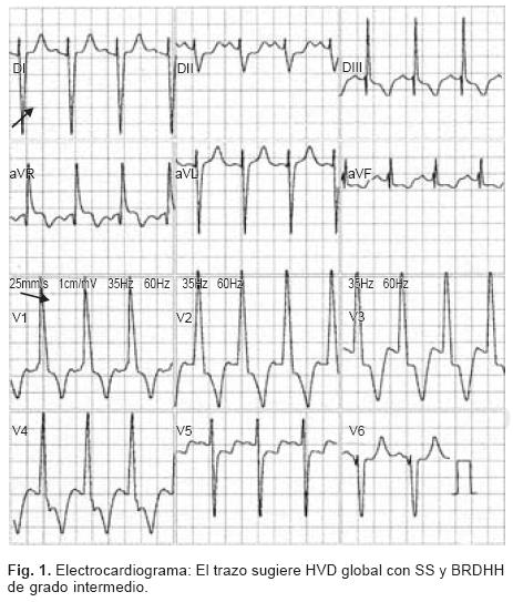 Este es el caso de una paciente del sexo femenino de 28 años de edad que inició su sintomatología a los 21 años con fatiga y disnea progresivas, ataque al estado general y mareos ocasionales, posteriormente a los 25 años de edad presentó presíncope con lipotimias recurrentes. A los 27 años presentó episodios de angustia y palpitaciones rápidas regulares de hasta 10 horas de duración que disminuían con el reposo. La sintomatología se acentuó una semana previa a su ingreso con ortopnea y disnea paroxística nocturna, edema ligero de miembros inferiores y episodios presincopales, motivo por lo que ingresó para diagnóstico y tratamiento hospitalario. El examen clínico destacó un soplo sistólico en foco accesorio aórtico II/IV y otro soplo regurgitante mitral I/IV sin irradiaciones. No presentó visceromegalias. Miembros inferiores con ligero edema. La telerradiografía de tórax mostró cardiomegalia Grado I/IV. El electrocardiograma evidenció ritmo sinusal, ÂQRS + 160. ÂT10°, rsR con TIDI de 80 msegs en aVR. Complejos ventriculares R de V1 a V3 con TIDI de 80 msegs, qrS en V6 con TIDI de 45 mseg; rsR con TIDI de 70 mseg en aVF. Onda T negativa en aVF y de V1 a V4, ± en V5, positiva y acuminada en V6. El trazo sugiere HVD global con SS y BRDHH de grado intermedio (Fig.1).