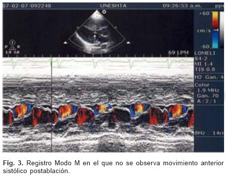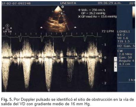 El ecocardiograma postablación mostró gradiente residual en la vía de salida del ventrículo izquierdo de 5 mm Hg sin evidencia de movimiento anterior sistólico de la válvula mitral (Fig.3), además de observar un mosaico por Doppler color (Fig.4) y un gradiente medio de 16 mm Hg en la vía de salida del VD registrado por Doppler pulsado (Fig.5), el cual no se registró a su ingreso, ni en el estudio de cateterismo. Como complicación postablación presentó BAVC transitorio que se resolvió a las 72 horas del procedimiento.