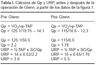 Después de la operación, la enferma mejora su saturación en aorta de 69% a 72% como resultado del incremento en flujo pulmonar, proporcionado por toda la sangre proveniente de la vena cava superior. Cuando en el cateterismo postoperatorio se calculó el flujo pulmonar aplicando la misma fórmula para Qp, (Qp = VO2/Vp Ap) resultó que al no haber salto oximétrico en la arteria pulmonar (el contenido de oxígeno en cava superior y en las arterias pulmonares es el mismo), el flujo pulmonar fue aún más reducido que el calculado antes de la operación, Qp de 1.65 1. La consecuencia de este valor de Qp, es que los valores de URP postoperatorios, resultaron superiores a los estimados antes de la operación: 2.1 versus 5.9. En la Tabla I, se resumen los cálculos obtenidos a partir de los datos de la figura 1.