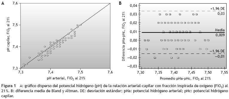 Methods: We obtained capillary–arterial blood gases simultaneously from subjects with stable cardiopulmonary disease in both conditions of inspired oxygen. Demographic, hemodynamic, diagnostic, and laboratory variables were gathered. Statistical analysis: agreement was analyzed with the intraclass correlation coefficient and the Bland–Altman procedure.