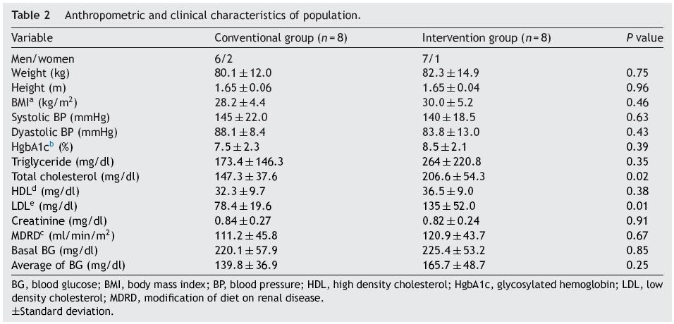 Nineteen patients participated in the study, three were eliminated, one due to electrode failure, and two more for not completing the requirements. The study algorithm is shown in Fig. 2. A population of 16 patients was randomized into two groups of eight patients each. The data distribution was normal according with Kolmogorov test. The demographic characteristics of the population, with means and standard deviations are shown in Table 1. In the control group, there were six men (75%) and two women (25%), whereas in the intervention group there were seven men (87.5%) and one woman (22.5%). Mean age was 55.2 years for the conventional group, and 54 years for the intervention group. We observed a statistically significant difference for dyslipidemia in both groups, with a P value of 0.002.