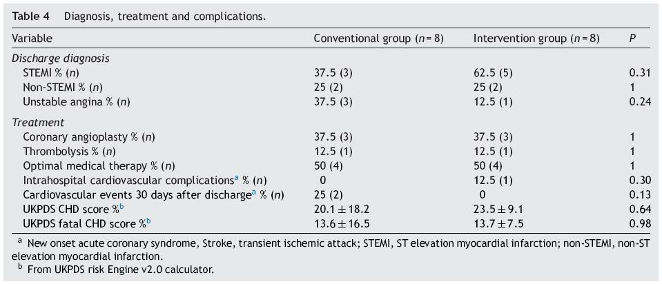 Discharge diagnoses, treatment employed, risk stratification obtained according to the UKPDS risk Engine calculator v2.020 as well as complications and mortality showed no statistically significant differences between groups, and are shown in Table 4.