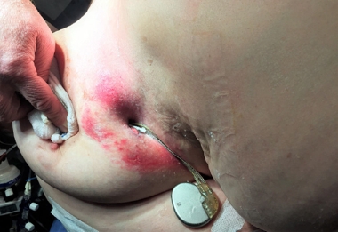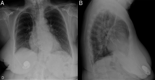 Presentamos el caso de una mujer de 80 años, con antecedentes de diabetes mellitus tipo 2 e hipertensión arterial controladas adecuadamente, portadora de marcapasos (MP) bicameral en modo DDD debido a bloqueo auriculoventricular completo hace 12 años. Actualmente, acude al observar un cuerpo extraño en el surco submamario derecho, lugar donde había recibido tratamiento previo con antimicóticos tópicos por presentar signos inflamatorios con sospecha de micosis, sin realizar control del MP. Al momento de la consulta se encontraba normotensa, afebril, y con una frecuencia cardíaca de 60 lpm debido a estimulación permanente de su MP, con ritmo sinusal basal. Al examen se objetivó el generador extruido a través del surco descripto, evidenciándose adecuada conexión con los electrodos (Fig. 1). La radiografía de tórax mostraba el MP fuera de la cavidad torácica, con electrodos adecuadamente ubicados en aurícula y ventrículo derechos (Fig. 2). Dada la contaminación del sistema, se realizó tratamiento antibiótico empírico y se decidió remplazar el sistema de estimulación endocárdico, tras extracción del mismo por esternotomía mediana, por uno epicárdico unicameral debido a la dependencia de la paciente a su sistema de estimulación. La paciente presentó buena evolución, y no mostró complicaciones durante 12 meses de seguimiento. La extrusión del generador de un MP es una complicación tardía, y se estima que su incidencia aproximada es del 1%. Se produce debido a la necrosis tisular por presión, y suele darse entre otras causas por desplazamiento del generador (a veces no fijado) posterior al implante, lo cual permite la migración, y así la erosión de los tejidos blandos hasta emerger a través de la piel1. Suele presentarse en pacientes añosos, con escaso tejido celular subcutáneo, y diabéticos, en los cuales existe una predisposición a infecciones tanto cutáneas como del dispositivo2. Debido a que la extracción no era posible sin la colocación de un nuevo sistema de estimulación, se decidió remover el dispositivo infectado por esternotomía y el implante simultáneo de un MP epicárdico, ya que no se recomienda la utilización de sistemas endovenosos en este tipo de pacientes por el riesgo de endocarditis y sepsis3.