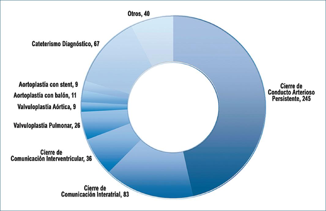 Se realizaron un total de 510 procedimientos, 300 en pacientes del sexo femenino, con una mediana de edad de 4 años, con rango de edad entre 8 días de vida y 77 años. Del total de procedimientos, 67 (13.1%) fueron cateterismos diagnósticos y 443 (86.9%) intervencionistas (Fig. 1). Dentro de los primeros, se llevaron a cabo estudios en pacientes en quienes existía duda diagnóstica a pesar de diferentes estudios de imagen realizados previamente, lo cual sirvió para definir un mejor diagnóstico anatómico y funcional en pacientes con cardiopatías congénitas complejas. También se llevaron a cabo estudios en pacientes con cardiopatía congénita e hipertensión arterial pulmonar severa para valorar la presión pulmonar y resistencias vasculares pulmonares, y realizar test de vasorreactividad con oxígeno al 100% para definir el plan quirúrgico de los pacientes.