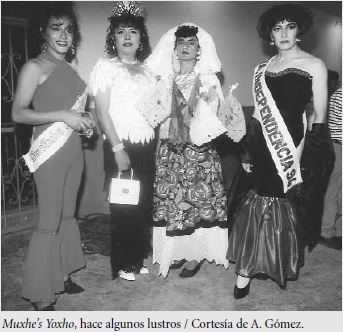¿Cuándo el travestismo es incorporado por los muxhe's como parte de su identidad sexo-genérica? Platicando con amigos muxhe's yoxho (adultos mayores de 50 años) que no visten de mujer, éstos comentaban que para ellos el travestismo es un asunto relativamente nuevo ya que en sus tiempos eso hubiera sido un atrevimiento. Agregan que los primeros signos del travestismo temprano entre los años 1950,1960 y 1970 que se mostraron en Juchitán fueron cuando los muxhe's empezaron a ponerse blusas muy coloridas, floreadas y holgadas, pantalones con cierre por la parte trasera como tradicionalmente se usa en las faldas de las mujeres, y ponerse flores, arriba de los oídos, a la hora de salir a la calle a vender o durante el trabajo de meseros en la cantina. Esta caracterización implicó un nuevo proceso de doble aceptación, por un lado, de la orientación sexual y por el otro, el de incorporar elementos llamativos no convencionales para la vestimenta de un varón en Juchitán.