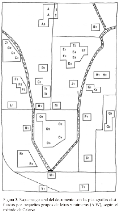 El método que apliqué, y que fue definido por Galarza (1962:15-19), se basa en el análisis completo, detallado y profundo de todos los elementos pictográficos y textuales del documento para descomponerlos, tratar de traducirlos y desentrañar su contenido. Todos los elementos dibujados o escritos que figuran en el manuscrito pictográfico cuentan, directa o indirectamente; cada uno tiene un significado; por lo tanto, cada uno es de capital importancia para el estudio y el conocimiento del conjunto del documento. Ninguno de los elementos pictográficos dibujados por el artista es decorativo; todos participan de la expresión y sirven para comunicar el pensamiento del tlacuilo. Son elementos que conducen al conocimiento del contenido temático. Para entender bien el contenido del documento, analicé todas sus pictografías, primero individualmente; luego por grupo para establecer las posibles relaciones existentes entre distintas pictografías y entre varios grupos. Como los dibujos presentan una organización en pequeños grupos, decidí designar cada uno de esos grupos con una letra mayúscula y dentro de cada grupo, cada pictografía con un número arábigo (fig. 3, p. 122). Las anotaciones en español o en náhuatl transcrito con letra latina también se analizaron y designaron con una letra mayúscula seguida por un número arábigo (Genotte, 1998: 211; Genotte, 2001: 133).
