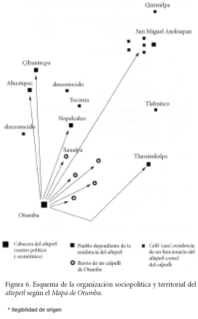 Otumba, con Teotihuacan, había sido una dependencia del altepetl imperial de Texcoco. Las dos ciudades-estados habían existido como distritos administrativos en el comienzo de la dominación del imperio de Texcoco (Gerhard, 1986: 213-214; Gibson, 1964: 11-12, 18, 90; Lockhart, 1992: 30, 46). Si bien fue dependencia del amplio altepetl de Texcoco, Otumba también fue un altepetl que abarcaba, por supuesto, un territorio más reducido. Sabemos que el altepetl de Otumba se volvió una encomienda de Hernán Cortés de 1521 a 1528. En 1531 pasó a ser un corregimiento. A partir de 1640, al corregidor español que residía en Otumba se le designaba habitualmente como alcalde mayor (Genotte, 1998:231-232; Gerhard, 1972: 70,93,1986: 214; Gibson, 1964: 27,43,422). Estoy convencido de que el proceso de reorganización sociopolítico posterior a la conquista, tal como lo describe Lockhart, se puede aplicar al altepetl de Otumba. Del estatuto de altepetl, que era el suyo antes de la conquista, Otumba pasó, en los años posteriores, al de encomienda española, y después al de corregimiento, sin perder nunca su antiguo estatuto sociopolítico.