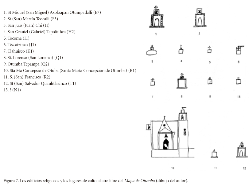 El contenido religioso del documento está representado por los trece edificios religiosos (figs. 2 y 7); ocho de ellos llevan un nombre de santo o de santa, muchas veces asociado con un topónimo náhuatl (1-4, 8,10-12) (E7, F3, H1, H2, Q1, R1, R2, T1). Su arquitectura es la del principio de la época colonial en la Nueva España, como lo atestigua el tipo de campanario de los edificios de grandes dimensiones, el llamado muro-campanario (espadaña) (fig. 7). La perspectiva jerárquica expresada en las dimensiones crecientes de los edificios ofrece una primera idea de la jerarquía religiosa católica contenida en el documento.