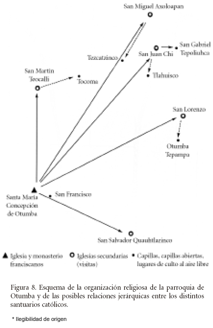 El proceso de formación de la parroquia (Lockhart, 1992) se puede aplicar al contenido religioso del Mapa de Otumba. Como lo demostré en la parte dedicada a la organización sociopolítica, Otumba fue el centro principal (cabecera) de un altepetl prehispánico, luego una encomienda hasta 1528, y un corregimiento de 1531 a 1640. Los franciscanos evangelizaron la región de Otumba desde 1524 y terminaron en 1527 la construcción de su primera residencia en esta zona (Diccionario de la historia... , 1986, II: 2162). También sabemos que los franciscanos administraron el monasterio de Otumba y su parroquia hasta la secularización de ésta en 1756 (Gerhard, 1986: 214). Resulta obvio, por lo tanto, que los franciscanos crearon una parroquia indígena (doctrina) basada en el altepetl y en la encomienda que ya existían. El templo de Santa María Concepción del monasterio de Otumba (asociado con la capilla San Francisco) se convirtió en la residencia del clero de la parroquia. Las iglesias secundarias (visitas) se edificaron en los varios subdistritos (calpultin) del altepetl. Esta jerarquía, por otra parte, está confirmada por varias fuentes etnohistóricas (Genotte 1998: 237-240; Genotte, 2001:142).