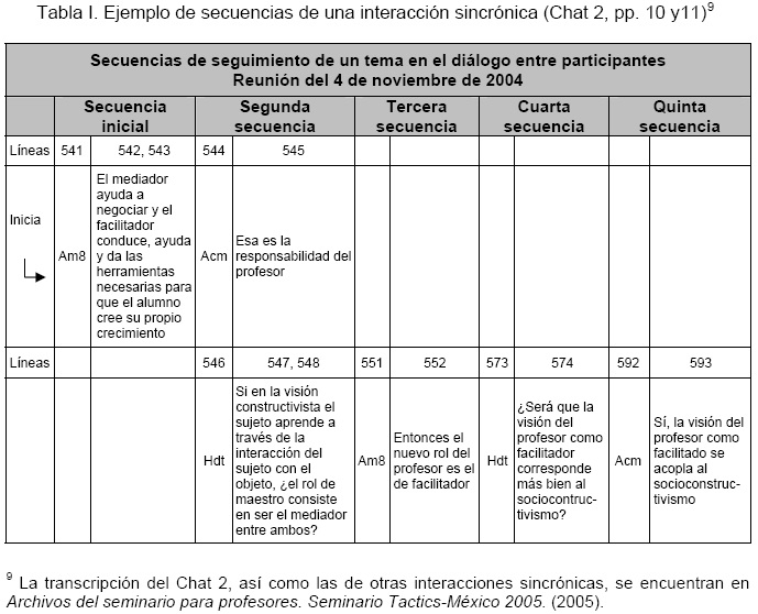9 La transcripción del Chat 2, así como las de otras interacciones sincrónicas, se encuentran en Archivos del seminario para profesores. Seminario Tactics-México 2005. (2005).