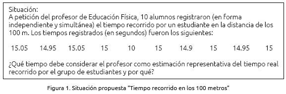 La tarea propuesta se presenta en el figura 1 y se tomó del cuestionario de Garret y García (2008); la tarea fue creada a partir de un problema de respuestas de elección múltiple desarrollado por Garfield y Konold (1992). El ítem de Estadística Descriptiva pretende evaluar el uso de la media como mejor estimador de un valor desconocido en presencia de errores de medida; la influencia de los valores atípicos en el cálculo de la media; la confusión entre media y moda; así como la importancia del contexto.
