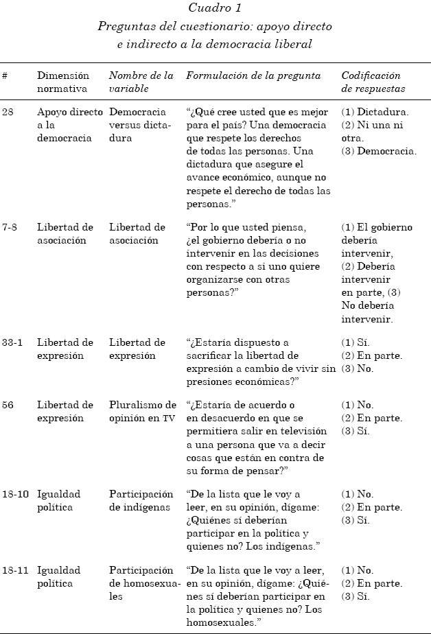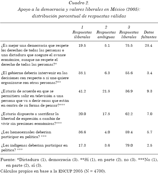 Para explorar, de manera ilustrativa, configuraciones de apoyo a la democracia y actitudes liberales entre los ciudadanos de nuevas democracias, usamos datos de la tercera Encuesta Nacional Sobre Cultura Política (ENCUP), aplicada en México en el año 2005. Se trata de la principal encuesta de opinión sobre actitudes políticas que se aplica en el país. Su aplicación fue encargada por la Secretaría de Gobernación (Segob) con la misión oficial de "diagnosticar sistemáticamente las peculiaridades de la cultura política prevaleciente en el país "(Segob, 2003: 1). Aplicada a nivel nacional en diciembre de 2005 (N = 4.700), incluyó 74 preguntas que abarcan varias dimensiones de cultura política, tales como interés por la política, conocimiento político, participación política, confianza interpersonal e institucional. Seleccionamos una pregunta que mide apoyo a la democracia como nuestra "variable ancla", más otras cinco que consideramos indicadores razonables de principios centrales de la democracia liberal (véase cuadro 1).12