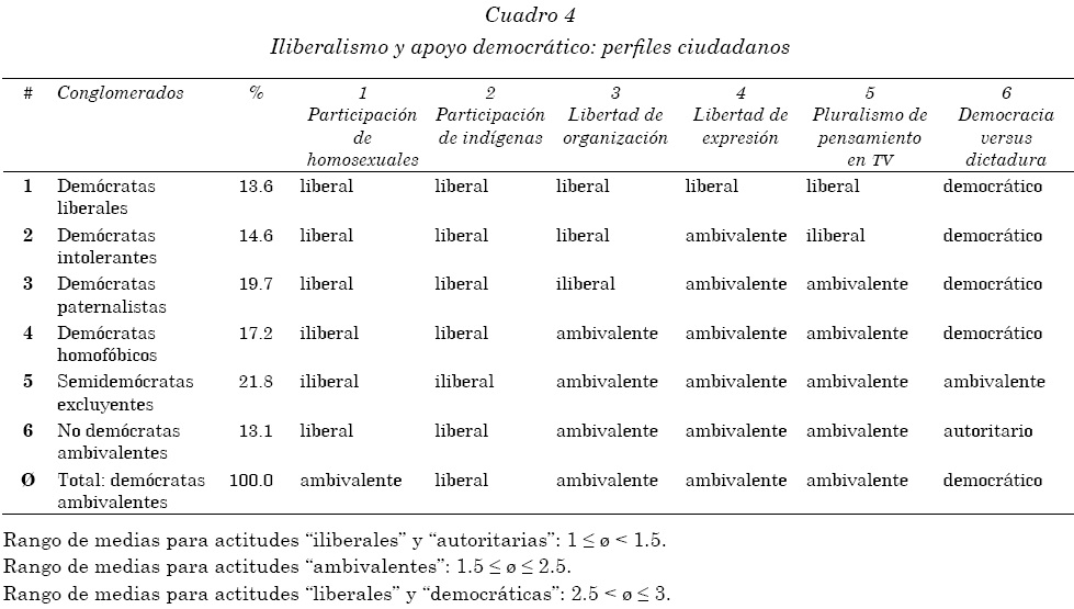 Demócratas homofóbicos. Los "demócratas homofóbicos" del conglomerado 4 manifiestan su apoyo a la democracia y su aceptación a que los indígenas participen en política, pero son abiertamente discriminatorios hacia los homosexuales, al abogar por la abolición de sus derechos ciudadanos. Además de mostrar una actitud tibia hacia las libertades de expresión y asociación, su disposición a llevar sus prejuicios sociales a la práctica y a desterrar a toda una categoría de ciudadanos de la arena política revela una oposición abierta a los derechos democrático-liberales. Si Ronald Inglehart está en lo correcto y la "tolerancia hacia la homosexualidad es un predictor [fuerte] de la democracia estable" (2003: 54), parece preocupante que los demócratas homofóbicos representen un grupo bastante numeroso, casi una quinta parte de la muestra (17.2%).