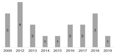 Finalmente, tenemos a Botswana, en África, y a Australia, en Oceanía, con un trabajo en cada país. En la gráfica 1 observamos que la mayor producción de los estudios se realizó en 2012, con cuatro publicaciones, y en seguida 2018, con tres estudios.