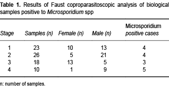Results. Results showed that 16/77 (20.77%) children presented Microsporidium and there was no relationship between microsporidial infection and diarrhea. Polymerase chain reaction was more effective than analysis by light microscopy of staining samples in the identification of the parasite.