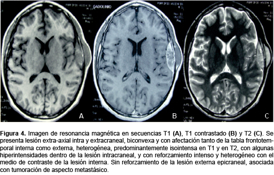 Ante la presencia de síndrome compartimental de la cavidad orbitaria, se realizó craneotomía fronto-orbitaria de forma urgente y la exéresis tumoral intra-orbitaria. Se obtuvo el estudio histopatológico de sarcoma de Ewing (Figura 2). Una vez ingresado al servicio de neurocirugía, se realizaron tomografías computarizadas de cráneo simple y contrastada (Figura 3), así como de resonancia magnética, que mostraron lesiones extra-axial, intra y extracraneal, biconvexa, con afectación tanto de la tabla fronto-temporal interna como externa, heterogénea, predominantemente isointensa en T1 y en T2, con algunas hiperintensidades dentro de la lesión intracraneal, y con realce heterogéneo con el medio de contraste endovenoso (Figura 4). La espectroscopía mostró un incremento en el pico de colina (Figura 5). Se realizaron estudios de extensión, consistentes en rastreo radiológico de huesos largos, así como gammagrama óseo, para tratar de identificar alguna lesión primaria en algún otro sitio. Sin embargo, todo fue negativo para algún proceso primario óseo. Con los datos imagenológicos y el deterioro clínico progresivo severo, cinco días posteriores al procedimiento de urgencia se realizó tratamiento quirúrgico: craneotomía parieto-temporal izquierda, con exéresis de la lesión que invadía tanto la región epidural como epicraneal. Se efectuó la ablación de una tumoración de coloración amarillo-blanquecina, blanda, bien delimitada en sus bordes de forma irregular, moderadamente vascularizada (Figura 6).