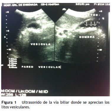 En marzo del 2011 se le diagnosticó un cuadro de apendicitis no perforada. Se realizó una apendicectomía abierta sin complicaciones. En agosto del 2011 ingresó en el servicio de urgencias con datos clínicos de colecistitis. Se le realizó USG, con el cual se diagnosticó litiasis vesicular, la vía biliar intra- y extrahepática normales, con paredes delgadas y múltiples cálculos biliares, sin datos de agudización. La glándula hepática, el páncreas y el bazo no presentaban anormalidades (fig. 1).