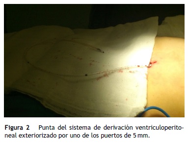 Se programó para el procedimiento. Se solicitó valoración preanestésica, y fue clasificado como un ASA II por el cuadro clínico y los antecedentes quirúrgicos. Se decidió realizar una colecistectomía laparoscópica con base en evidencia de la literatura y en consenso con neurocirugía. Se procedió a realizar la exteriorización de la VDVP, bajo anestesia general balanceada, con un tiempo quirúrgico de 80 min, manteniendo presiones de insuflación entre 12 y 14 mmHg; se colocaron tres puertos de 5 mm y un puerto de 10 mm a nivel umbilical utilizando un lente de 30 grados y 5 mm. La punta del catéter de la VDVP se visualizó y se exteriorizó a través de un orificio realizado en la pared abdominal con un puerto de trabajo de 5 mm, el cual fue colocado en el flanco derecho del paciente y retirado al exteriorizar la punta del catéter para evitar las fugas de CO2 o disfunción del catéter durante el procedimiento (fig. 2).