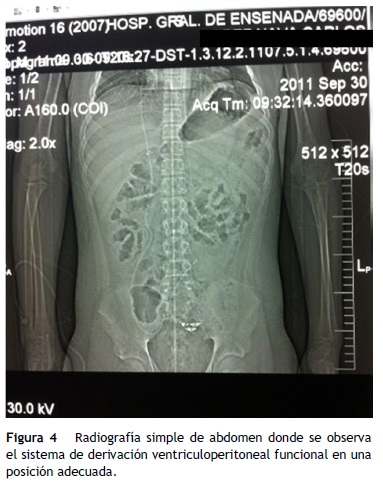 Se egresó con paracetamol como analgésico y amoxicilina con ácido clavulánico vía oral durante 7 d más en su domicilio. El paciente continuó en seguimiento por cirugía pediátrica (fig. 3), sin complicaciones. Por otro lado, el servicio de neurocirugía reporta la tumoración sin crecimiento y la hidrocefalia en control con catéter y válvula de derivación ventriculoperitoneal funcional (fig. 4).