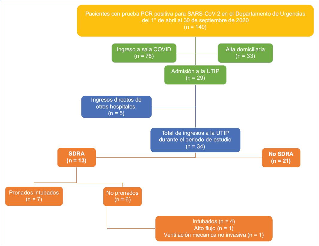 Figura 1 Pacientes con prueba de reacción en cadena de la polimerasa (PCR) positiva para SARS-CoV-2 en el departamento de urgencias, del 1 de abril al 30 de septiembre de 2020. SDRA: síndrome de dificultad respiratoria aguda; UTIP: unidad de terapia intensiva pediátrica.