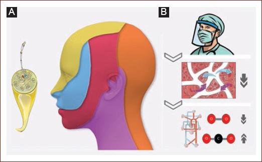 Figure 1 A: pressure or tractional forces from the objects may lead to local tissue damage and exert an irritative effect on sensory nerves (green area: ophthalmic nerve, blue area: maxillary nerve, purple area: mandibular nerve, yellow area: cervical nerves, pink area: superficial cervical plexus). B: prolonged use of face masks may lead to an alveolar hypoventilation that will cause hypoxemia and hypercapnia.
