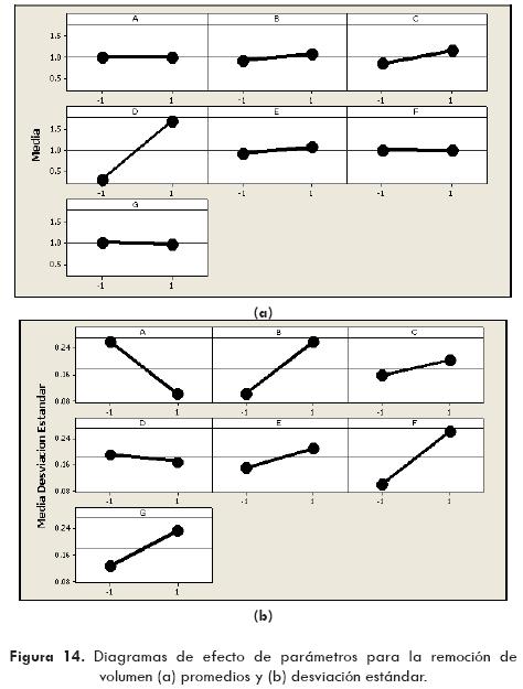 Como se puede apreciar los experimentos se replicaron 3 veces para cada configuración. Se determinó el promedio de volumen removido y la desviación estándar para el conjunto de experimentos realizados. La Figura 14(a) muestra el rendimiento promedio de cada nivel de factor durante el proceso de Micro-EDM. A partir del análisis de los resultados se puede establecer que el parámetro D (voltaje suministrado) presenta la mayor influencia y corresponde; le sigue con menor influencia el parámetro C, (valor de la capacitancia).
