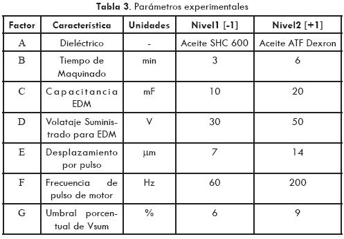 El volumen removido fue considerado como el parámetro de desempeño a maximizar de manera directa. Los factores que se consideraron más relevantes en el proceso de micro-EDM son presentados en la Tabla 3.