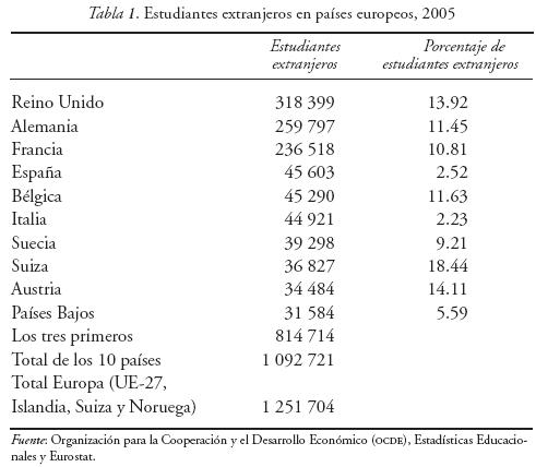 En términos absolutos, los estudiantes optan preferentemente por Alemania, Francia y el Reino Unido. No obstante, los porcentajes de estudiantes extranjeros en los diferentes países ofrece una imagen distinta. En este caso Austria, Bélgica y Suiza tienen además una diversidad significativa entre sus estudiantes. Tremblay argumenta que los estudiantes extranjeros que optan por estos tres países lo hacen atraídos por la prosperidad económica y el alto nivel tecnológico (Tremblay, 2002). Se puede explicar el movimiento hacia esos países por tres factores. Primero, el prestigio de los centros; segundo, la importancia del idioma Austria, Bélgica y Suiza tienen universidades de alto nivel en alemán, francés y/o inglés, y tercero, la influencia de factores institucionales. Además, se añade otro factor, las tasas de matrícula, que en estos países son más bajas que, por ejemplo, en el Reino Unido o Estados Unidos. No obstante, Alemania, Francia y el Reino Unido reciben, en términos absolutos, más estudiantes extranjeros que los restantes países europeos. Kuptsch previene contra una utilización errónea de estos datos, puesto que incluyen también a estudiantes extranjeros que residen desde hace tiempo en esos países, y no sólo a los que se quedan exclusivamente por motivos de estudios (Kuptsch, 2006). Sin embargo, la autora señala también que si sólo se contara a los estudiantes que llegan a Europa exclusivamente para estudiar, Alemania, Francia y el Reino Unido de igual manera se ubicarían en los tres primeros lugares. Al principio todos los gobiernos de la unión europea se mostraban satisfechos de recibir estudiantes extranjeros, puesto que con ello buscaban establecer o mejorar las relaciones políticas o económicas con los países de origen de los estudiantes (ICMPD, 2002). Bélgica, España, Francia, Portugal y el Reino Unido han mantenido su relación como antiguas metrópolis coloniales mediante la recepción de estudiantes de sus antiguas colonias. Por otra parte, Alemania, Austria, dinamarca, Finlandia y Suecia han ofrecido amplio acceso a sus servicios educativos a personas de países en tránsito en Europa central y Europa del Este, para así intensificar su relación con estas naciones.