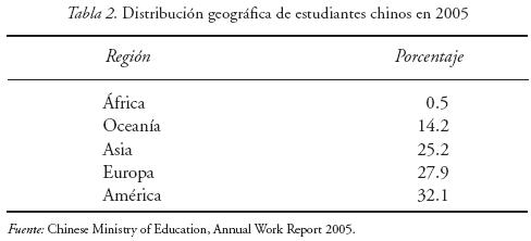 La tabla 2 muestra que en 2005 Europa recibió prácticamente un tercio de los estudiantes chinos que emigraron al extranjero.