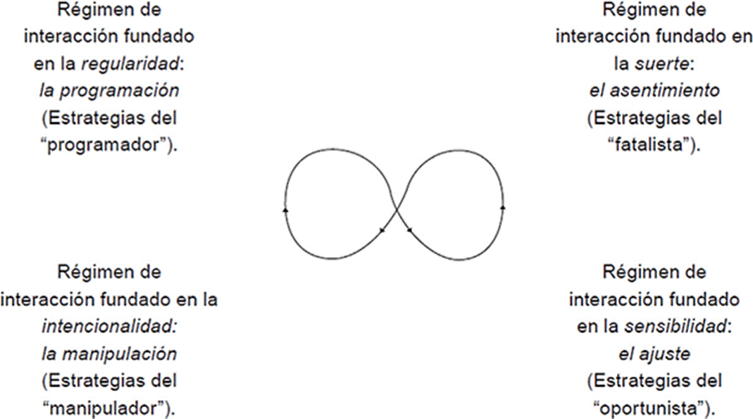 El principio subyacente a este régimen de interacción es el de sensibilidad, vinculado con la estesia, esto es, con la capacidad de sentir la presencia del otro, lo que implica la capacidad de ajustarse a ese otro, sea de la naturaleza que sea. Finalmente, el régimen del asentimiento “a los decretos de la suerte” tiene un componente fatalista, ya que quien lo lleva a cabo está “decidido a someterse cueste lo que cueste a lo que le acontece” (Landowski 2016, p. 19), a partir de un principio subyacente asociado a la suerte y al azar, en tanto los individuos que siguen este modus operandi creen que “es más seguro dejarse llevar por su buena estrella y se contentarán con cruzar los dedos esperando algún feliz accidente que la providencia haya decidido preparar para ellos” (Landowski, 2012, p. 142).