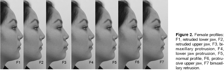 The sample was composed of 30 dentists, 30 orthodontists and 30 patients attending the Graduate School of the National School of Dentistry, National University of Mexico (UNAM). Dolphin Imaging and Graphics program® was used to scan profile pictures of Mexican men and women either with Class I or normal cephalometric values. Using Dolphin Imaging and Graphics® lateral cephalograms of 2 subjects in natural posture were scanned. Lateral cephalogram and profile images of each subject were adjusted using a simulated computer-analysis used for orthognathic surgery. Original images (M4 in figure 1 and F5 in figure 2) with their respective lateral cephalometries were used to generate another 6 manipulated images. In these created images, hard tissue normal values were altered in at least two standard deviations. Facial profile images were digitally manipulated in the anterior-posterior plane with little or no changes in the vertical plane. This was performed so that each generated profile would have a normal vertical proportion. These seven profiles were used for the possible growth of upper and lower jaw variations, as well as a bi-maxillary protrusive profile typical of Mexican subjects, and bi-maxillary retruded profile representing the typical straight profile in Caucasian subjects. Each image only had one manipulated dental or skeletal component. Mexican female and male profiles are as follows: M1 and F3 (bi-maxillary protrusion). These represent profiles with an advanced degree of upper and lower alveolar segments with upper and lower increase of incisor inclination which produces protrusion of upper and lower lip without altering the lower jaw 's anterior-posterior profusion. M2 and F 4 (lower jaw protrusion) represent profiles having only lower jaw development. M 3 and F 1 (lower jaw retrusion) represent profiles with posterior positioning only in the lower jaw. M4 and F5 (normal profile) represented Mexican profiles with skeletal Class 1 basal relation and incisor Class 1 with average of cephalometric normal values. These were used as templates from which the other profiles derived. M5 and F2 (upper jaw retrusion) were digitally-constructed profiles with only maxillary posterior placement. M6 and F6 were digitally built with only upper jaw anterior development. M7 and F7 (bi-maxillary retrusion) were digitally built to represent flat profiles with straight upper and lower incisors, and lesser anterior protrusion of alveolar segments according to features of Caucasian profiles.