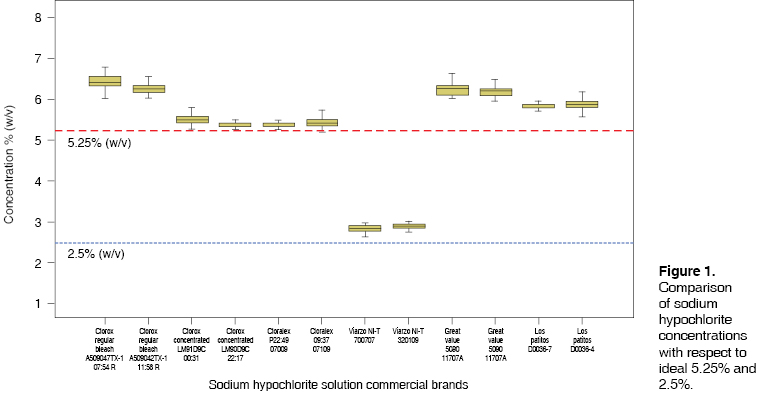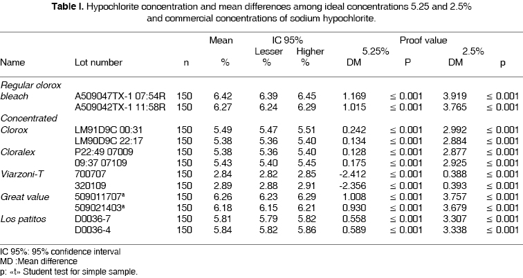 The following was observed: concentration (mean IC- 95%) of Clorox Regular Bleach (6.34, 6.32-6.36), Concentrated Clorox (5.43, 5.42-5.45) Cloralex (5.40, 5.48-5.41), Great Value (6.21, 6.19-6.23) and ''Los patitos'' (5.82, 5.80-5.83) exceeded the ideal 5.25% hypochlorite concentration. Viarzoni-T (2.86, 2.85-2.87) showed concentration higher than the ideal one (2.5% w/v).