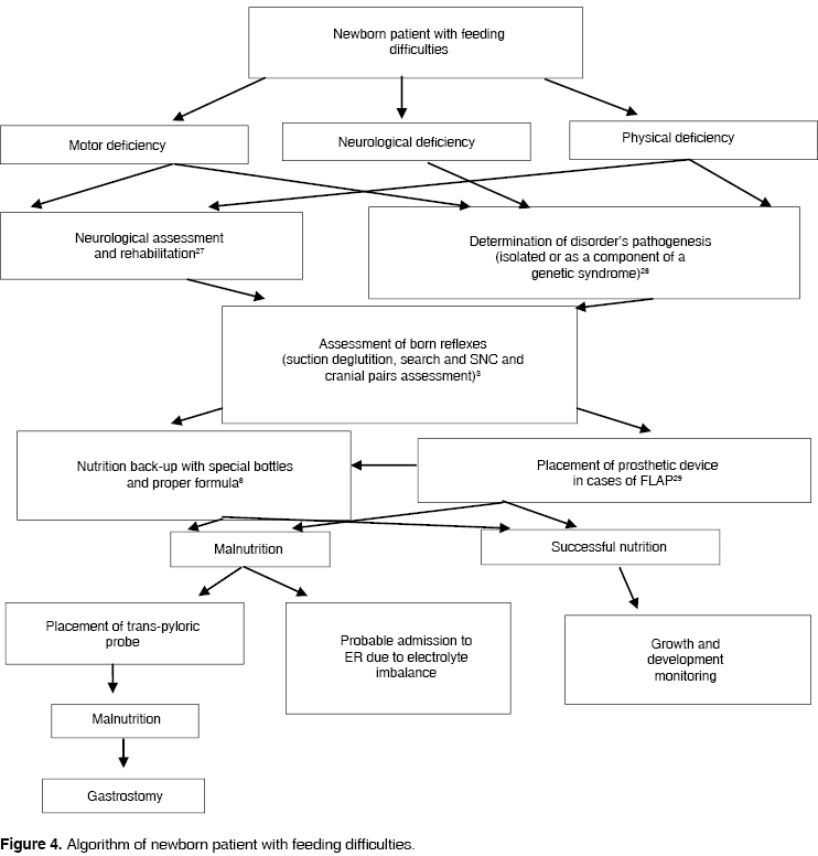 The main problem of feeding disorders in the newborn is closely related to lack of coordination with the breathing process. Parents must be educated into realizing that techniques must not interfere.13 As an example we can mention FLAP, where sealing plates are placed14 to separate oral way from nasal cavity, as well as ensuring vertical position to ease the passage of the bolus,15 lateral decubitus position in dysmorphiae in order to avoid glossoptosis, decreasing the diameter of the feeding bottle in cases where the patient possesses deglutition and suction abilities, but tires easily (cardiopathies, neuropathies, FLAP). Parents must be very patient and count with proper medical counseling.3 The use of certain devices, like taps in the feeding bottle, adaptation of pacifiers to syringes to propel milk, or drop-by-drop feeding are also recommended when feeding disorders do not endanger the patient's life, and it is just a case of integrating the newborn into normal function.16